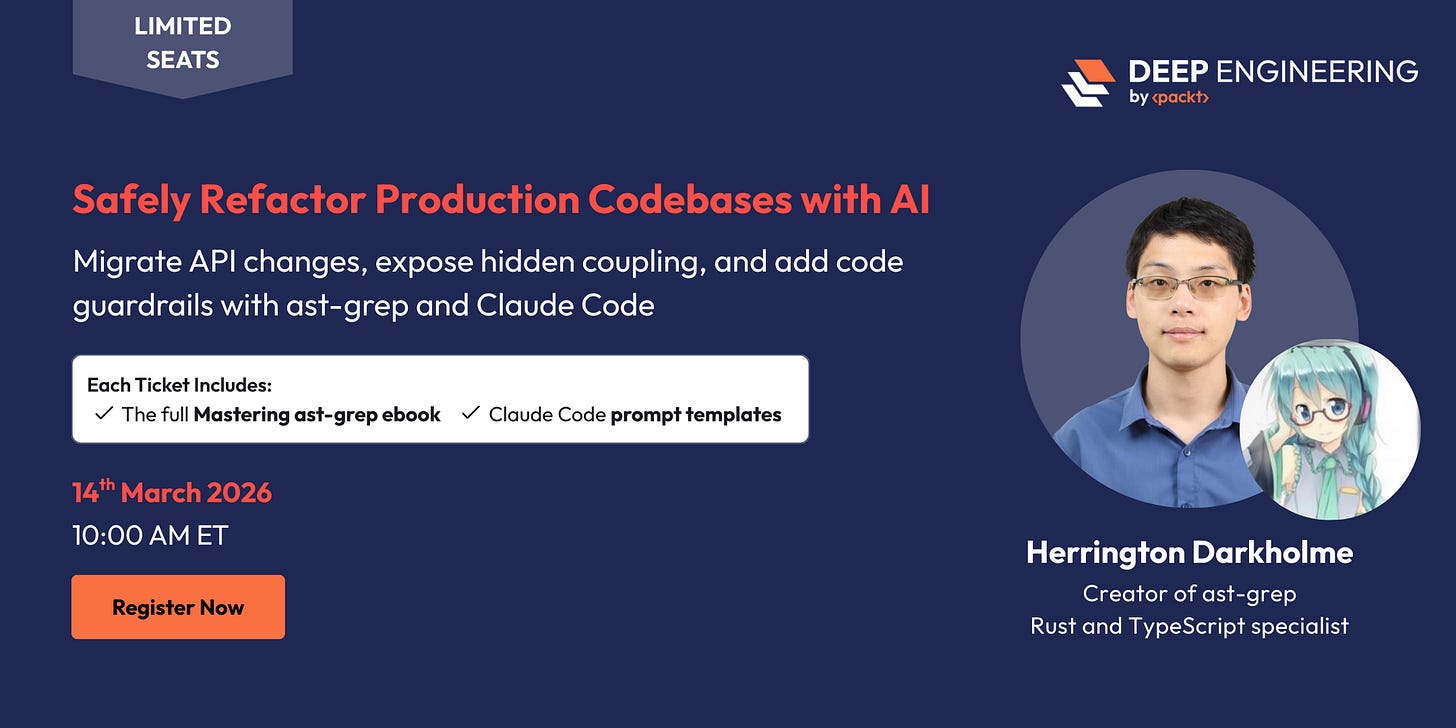 Refactoring production systems is risky, especially when API changes and hidden coupling are involved. In this Deep Engineering session, learn how to safely evolve real-world codebases using ast-grep and Claude Code, with practical guardrails you can apply immediately.