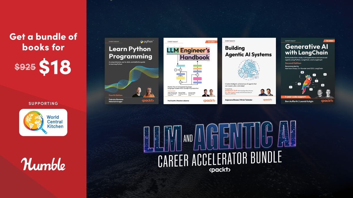 Build real skills in LLMs and agentic AI with this 20+ course Packt bundle, featuring titles like Learn Python Programming, 4E and The LLM Engineer’s Handbook. Learn how to design and deploy intelligent systems while supporting World Central Kitchen.
